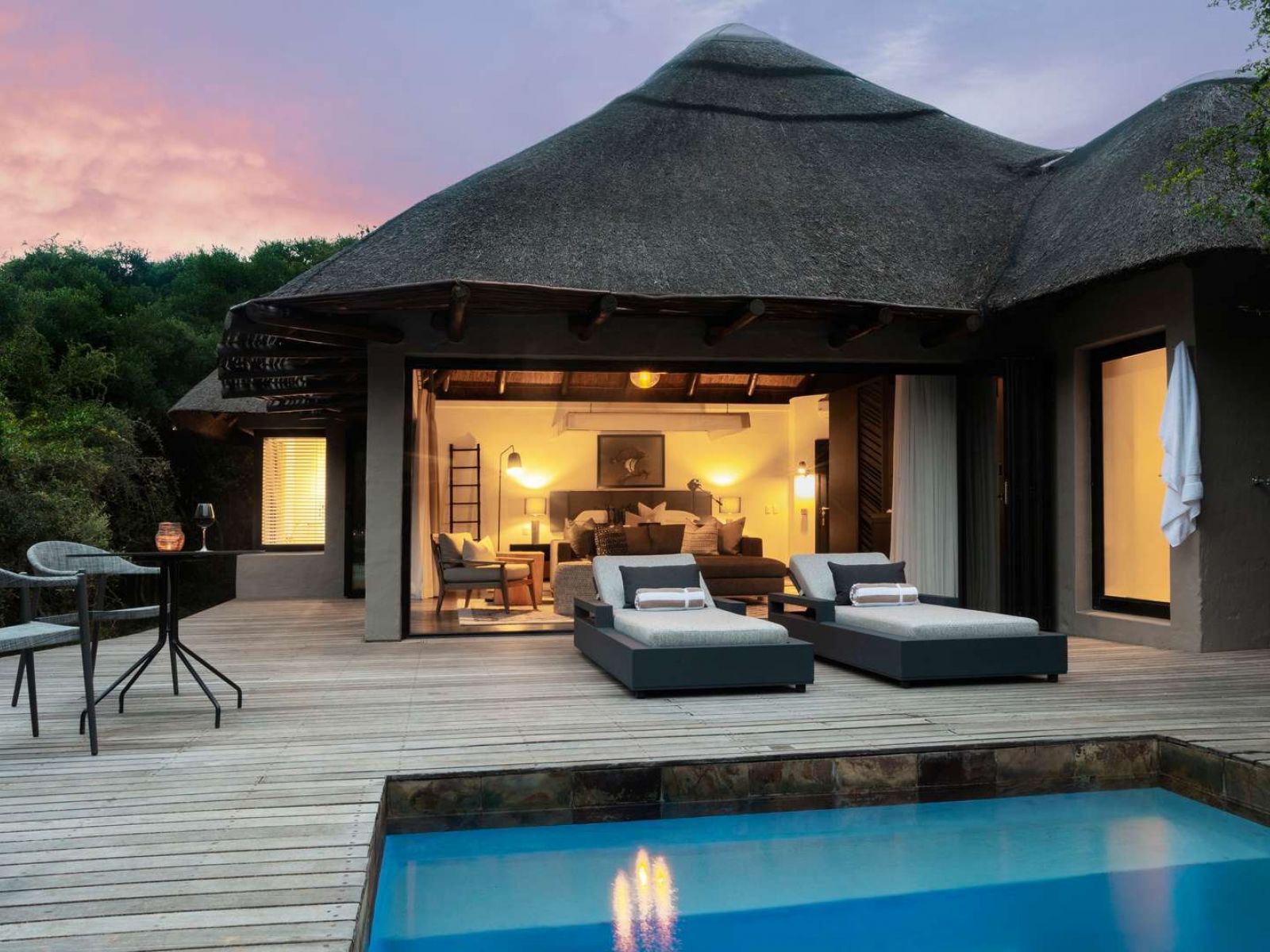 Relax and enjoy the privacy at this all suite lodge in the heart of Shamwari Eagles Crag is Shamwari’s most opulent lodge. There are only nine suites – meaning there's only 18 guests at any one time –and the service is impeccable. From the moment you arrive you’ll be well taken care of and should you want for anything, you’ll find it swiftly delivered. Dining takes place within the dining room and also around the camp fire in the boma. You’ll take some meals with your vehicle group, including your guide which can be a great time to learn all about the wildlife you saw that day or want to see during your stay. There's plenty of space for unwinding including an upstairs lounge and bar with an open terrace, and a downstairs lounge with a large television and billiard table. There is also a wonderful spa, with a great range of treatments on offer to further enhance your luxury stay in the midst of the African bush. Each Suite is pure luxury, with a heated plunge pool surrounded by decking with a bird-spotting scope, as well as all your modern conveniences. Television-free Suites means no distractions from the greatest wildlife show going on right outside your Suite.